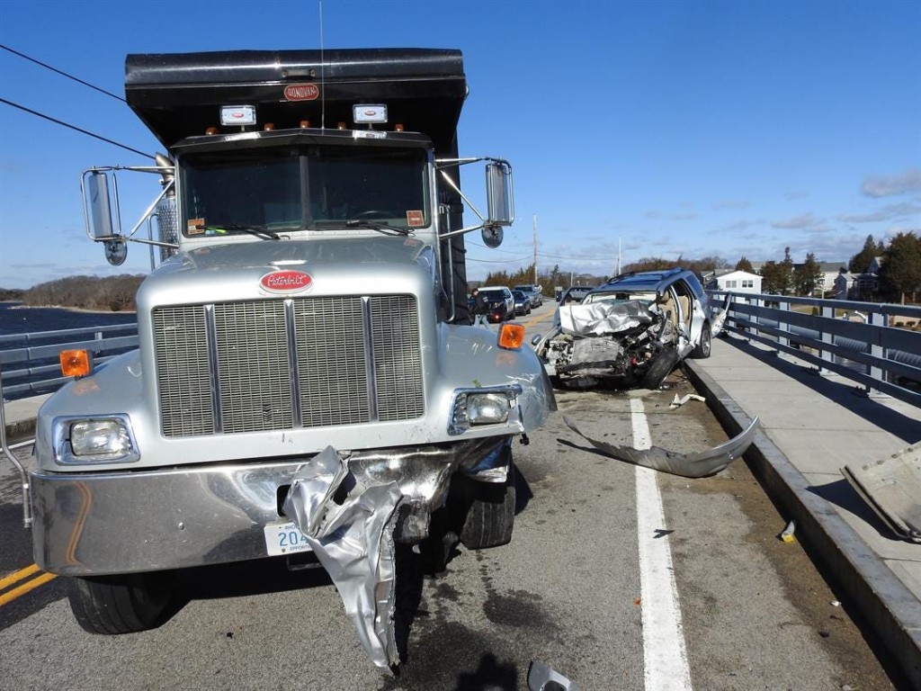 Police say a Ford Escape crashed with a dump truck on The Escape Bridge off of Point Road at approximately 9:45 a.m.