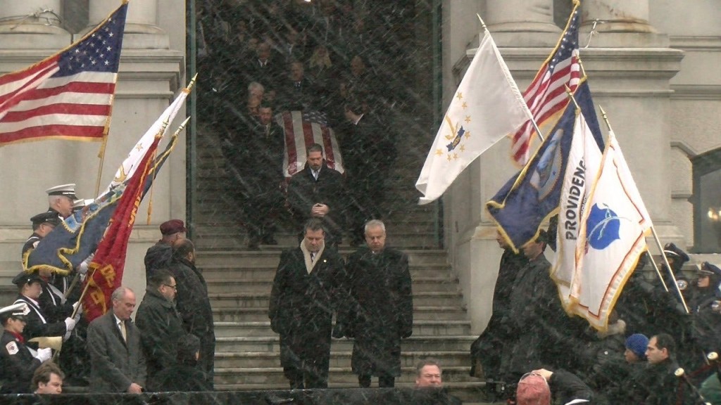 A crowd formed outside City Hall Monday morning as Buddy Cianci’s casket was carried down the front steps. Snowy conditions weren’t enough to keep people from seeing the former Mayor leave City Hall one last time and paying their respects.