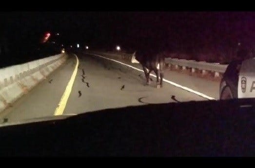 A photo from the dash cam in the cruiser shows the cow taking a stroll down Route 78 Sunday. He kept going for about 30 minutes before officers, with the help of the folks at Lewis Farm, were able to corral him.