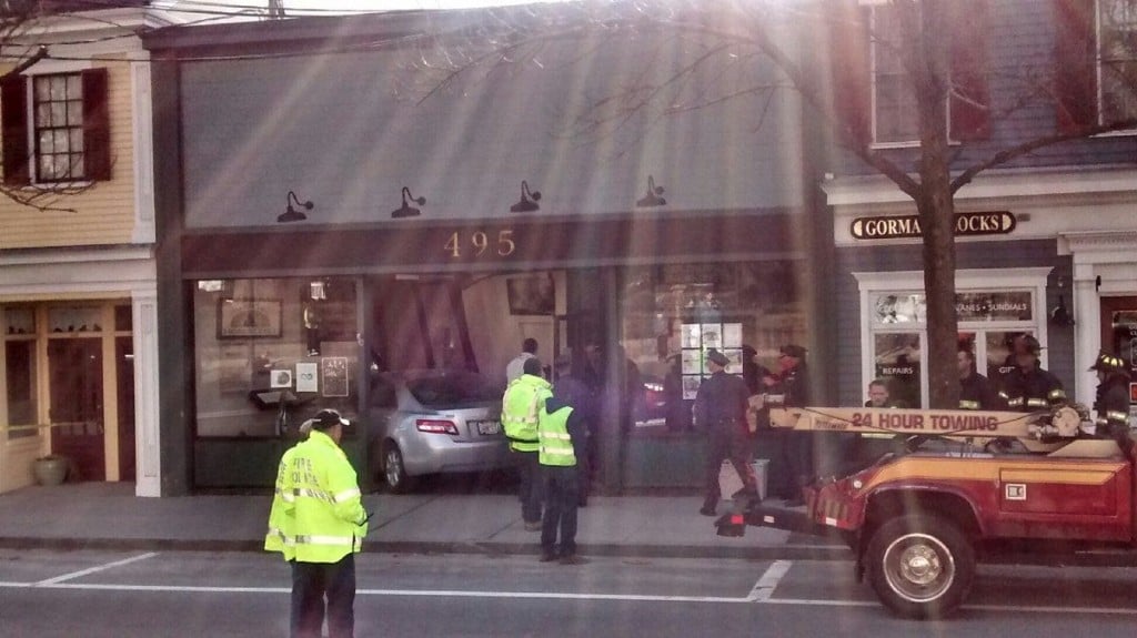 BRISTOL, R.I — A car slammed into the front window of a small business complex in Bristol Monday afternoon.