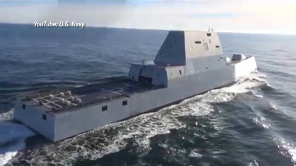 The 610-foot-long warship has an angular shape to minimize its radar signature. It cost more than $4.4 billion. It was commissioned last month in Maryland.
